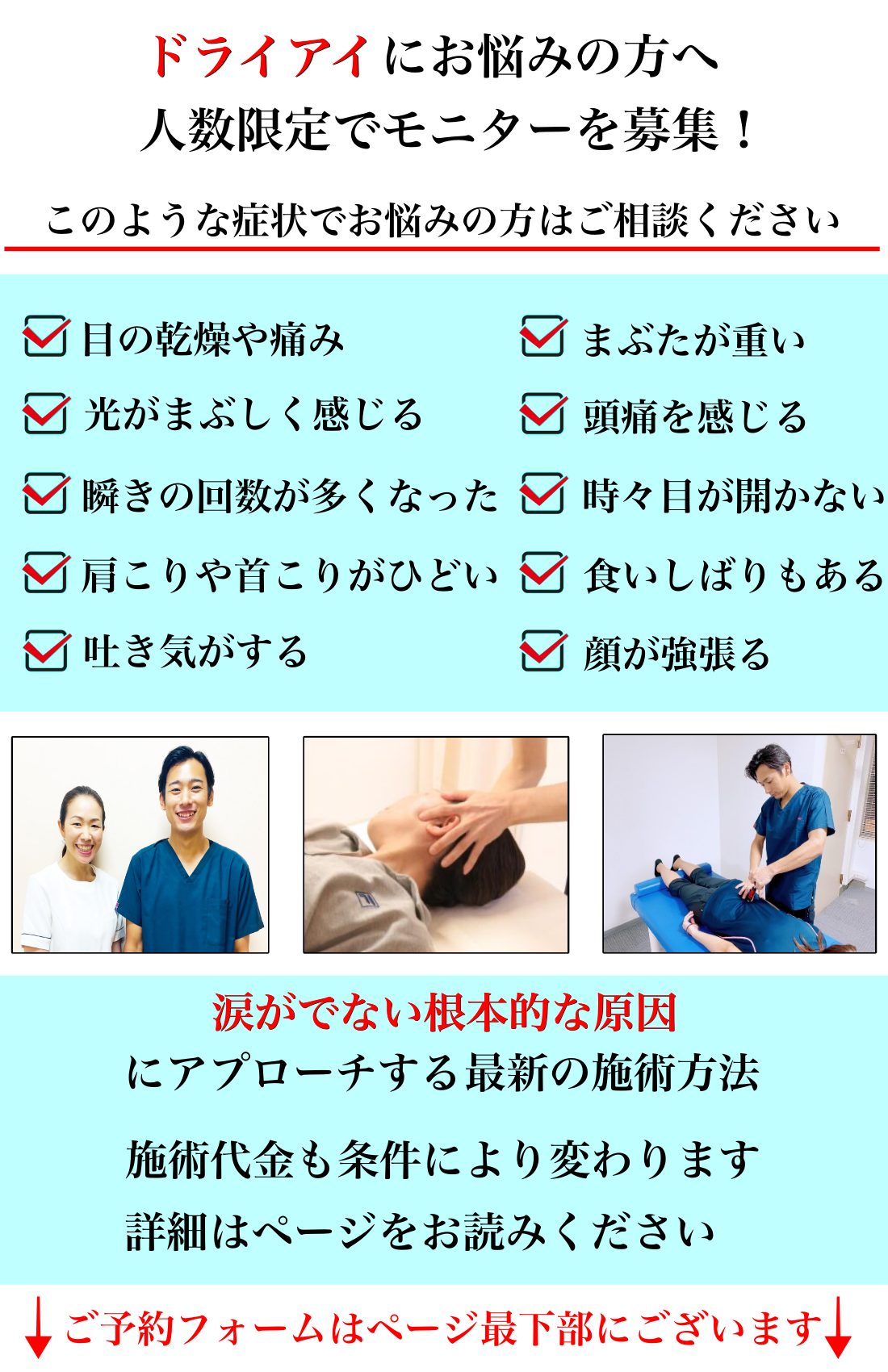 今回モニターという形で施術を受けて頂いきい理由は、もっと多くの方にドライアイの原因と解決できるお悩みなんだと知って頂き、実際に効果を実感して欲しいためです。